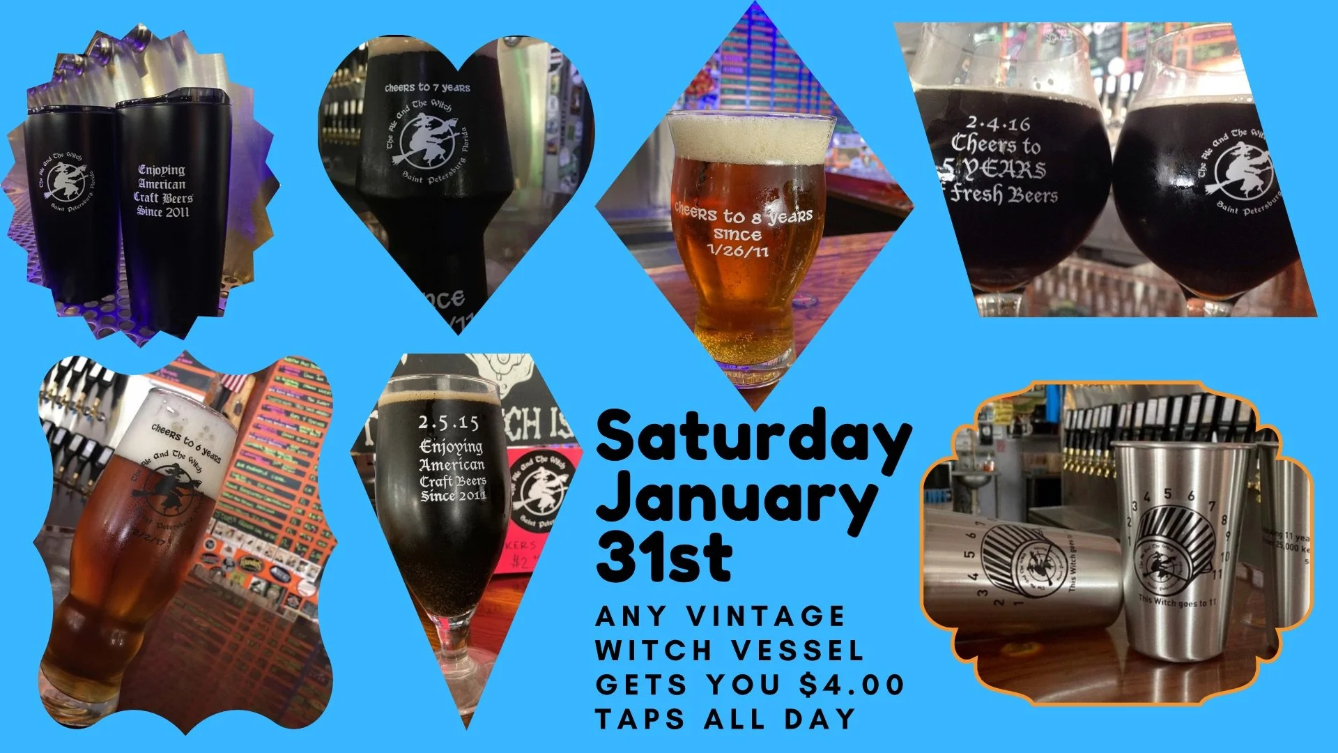 Bring any Vintage Witch Anniversary Glass, Tumbler or Stainless Steel Cup with you and enjoy any tap for just $4 each from open (3pm) to close (11pm) on Saturday January 31st.