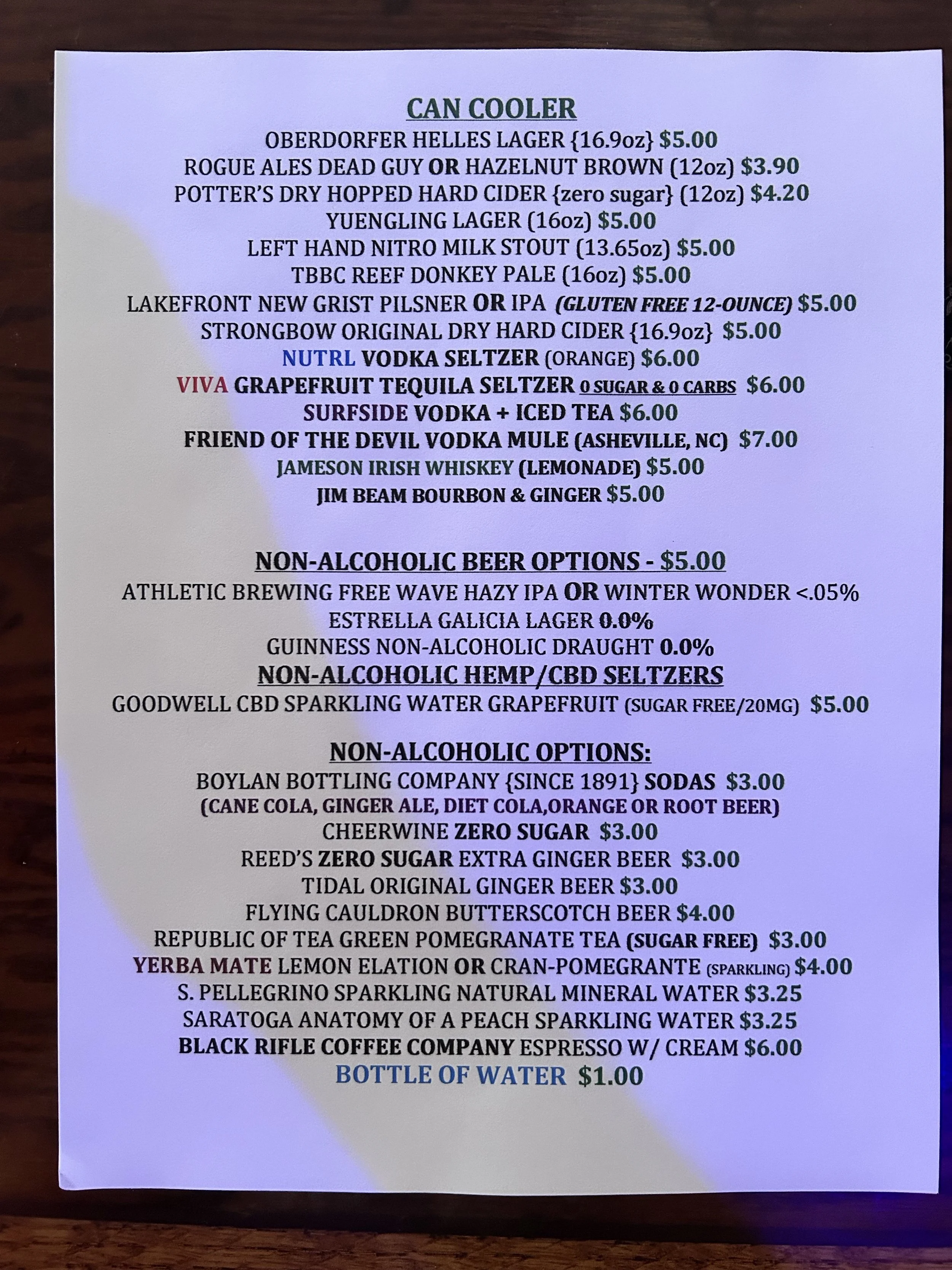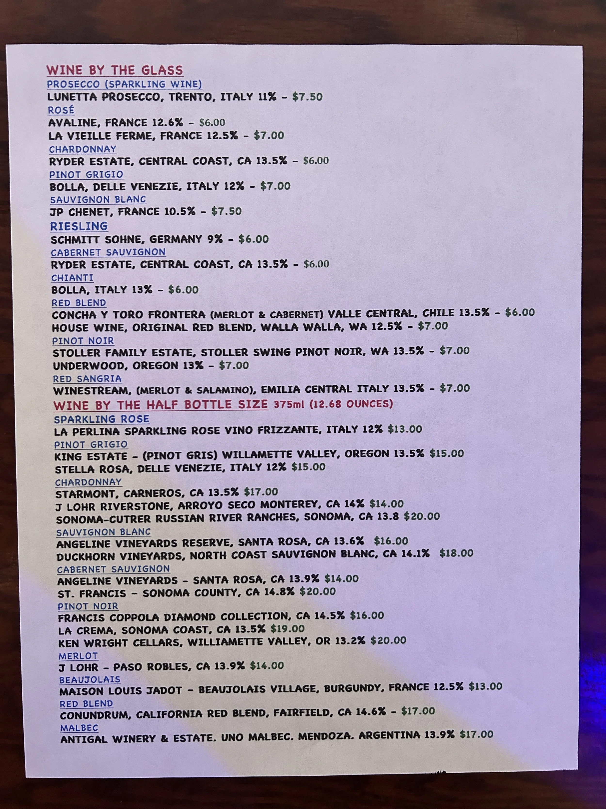 Our Wine List and our Non Alcoholic Options offered as well as any seasonal specialties.